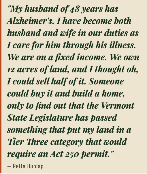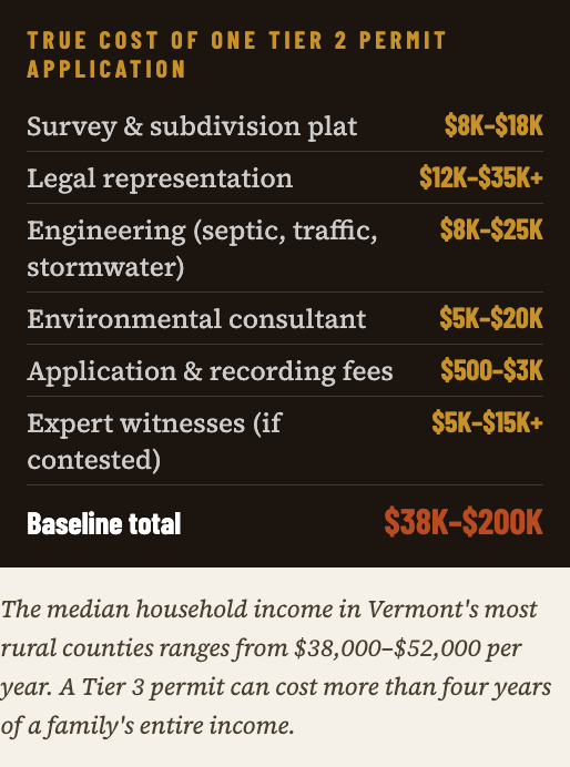 Retta's situation is far from unique. Vermont's most rural counties have median household incomes of just $38,000–$52,000 per year — yet a Tier 3 Act 250 permit can cost $75,000 to $200,000. For elderly Vermonters on fixed incomes, land is often their only financial asset — and Act 181 locks it away.